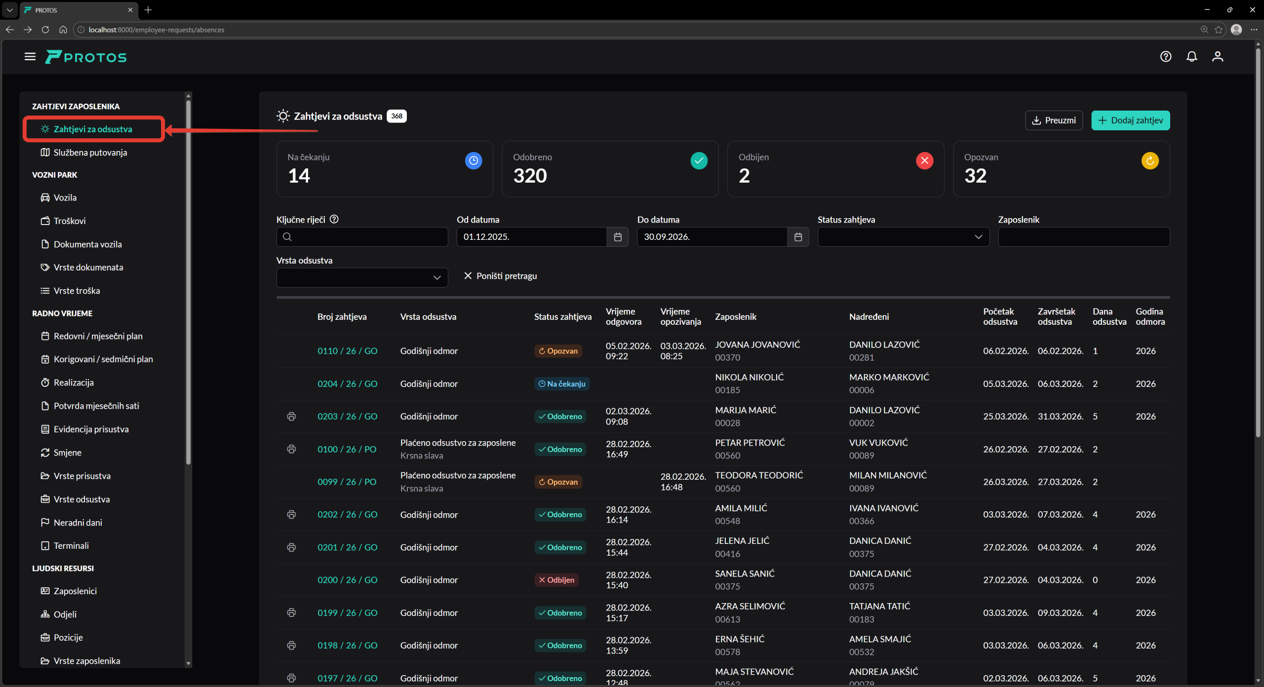 - Zahtjevi zaposlenika > Zahtjevi za odsustva – lista zahtjeva koju vide menadžeri i nadređeni. U ovoj listi prikazani su zahtjevi zaposlenika za koje korisnik ima pravo pregleda i odlučivanja.