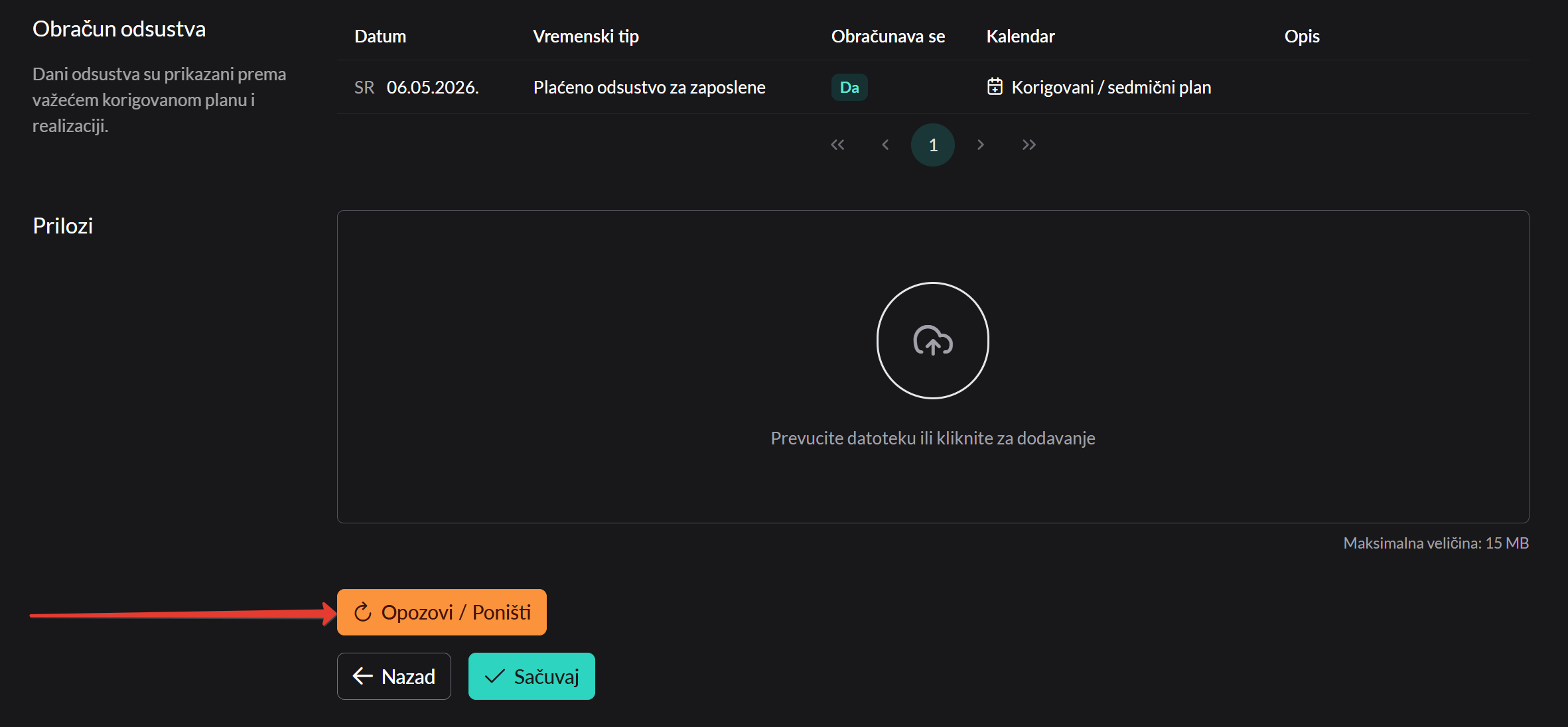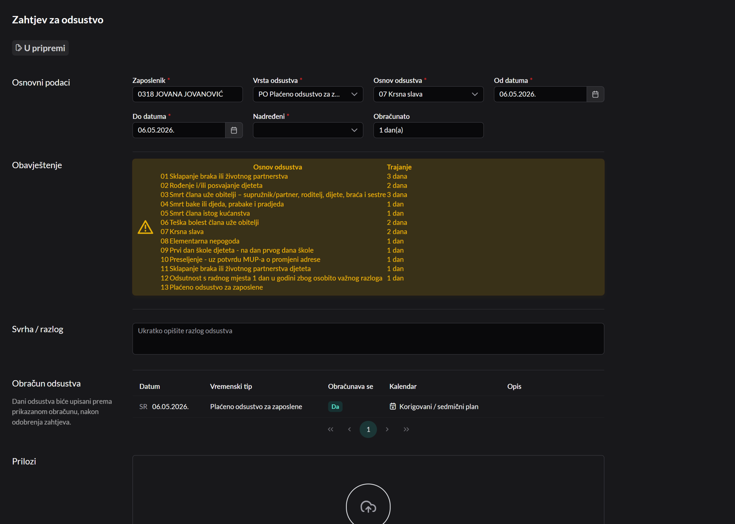 | Prilozi | Mogućnost dodavanja prateće dokumentacije uz zahtjev za odsustvo, kao što su potvrde, rješenja ili drugi relevantni dokumenti. Priloženi fajlovi služe kao dodatno obrazloženje ili dokaz za podneseni zahtjev. |