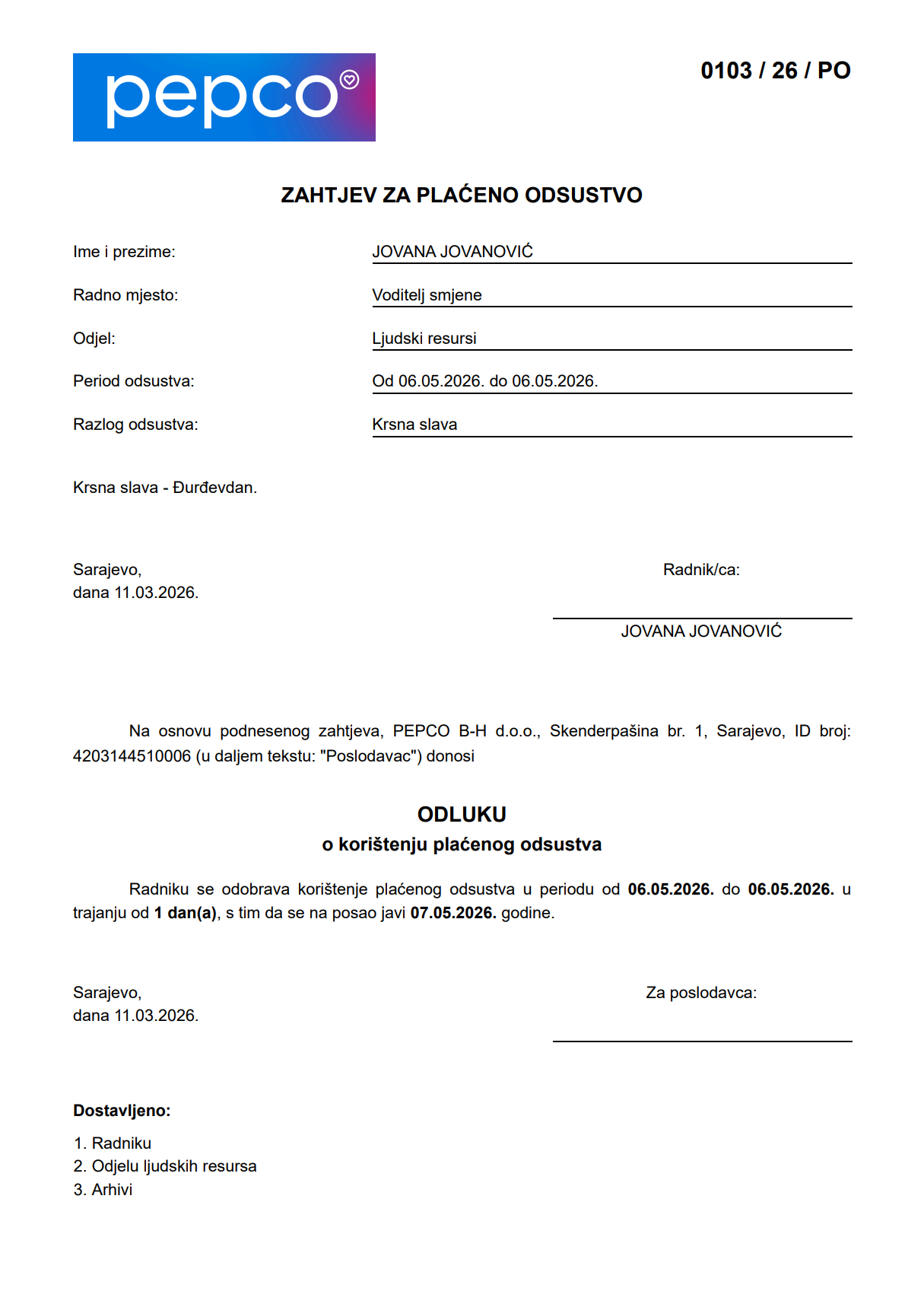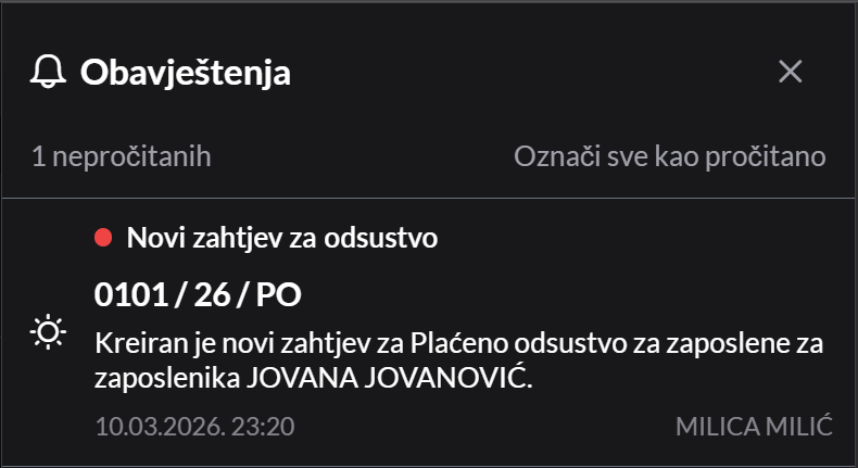 | Obavještenje | Obavještenje za zaposlenika i nadređenog prikazuje se samo za određene vrste odsustva, ukoliko je to definisano podešavanjima. |
