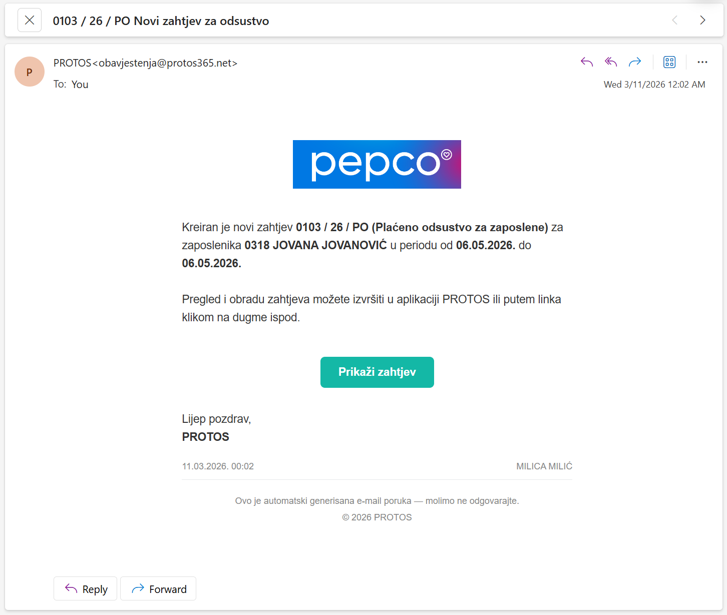 Nadređeni će istovremeno dobiti obavještenje i putem e-pošte. Klikom na dugme Prikaži zahtjev otvara se anonimni link za pregled, odobravanje ili odbijanje zahtjeva, za koji nije potrebno prijavljivanje u sistem. Link sadrži jedinstveni sigurnosni token na osnovu kojeg sistem prepoznaje korisnika koji donosi odluku o zahtjevu.