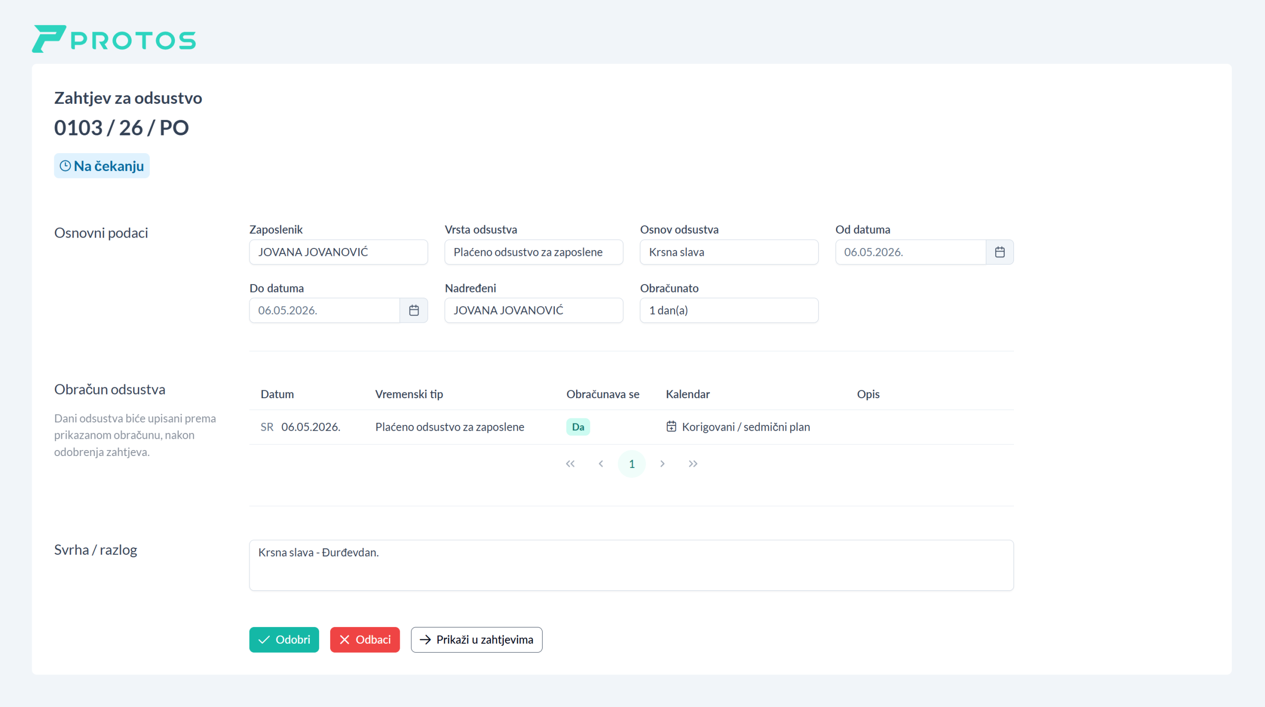 Nakon podnošenja zahtjeva za odsustvo, nadređeni koji treba da ga odobri može pregledati obavještenje o podnesenom zahtjevu u aplikaciji, kao na slici ispod. Klikom na obavještenje otvara se stranica sa kompletnim podacima i opcijama na dnu zahtjeva za njegovo odobravanje ili odbijanje.