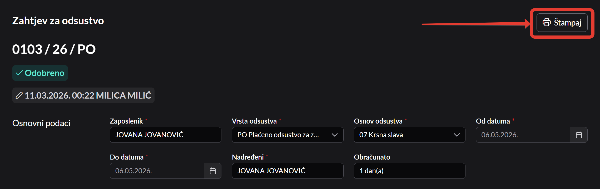 | Od datuma – Do datuma | Period za koji se ponosi zahtjev za odsustvo. |