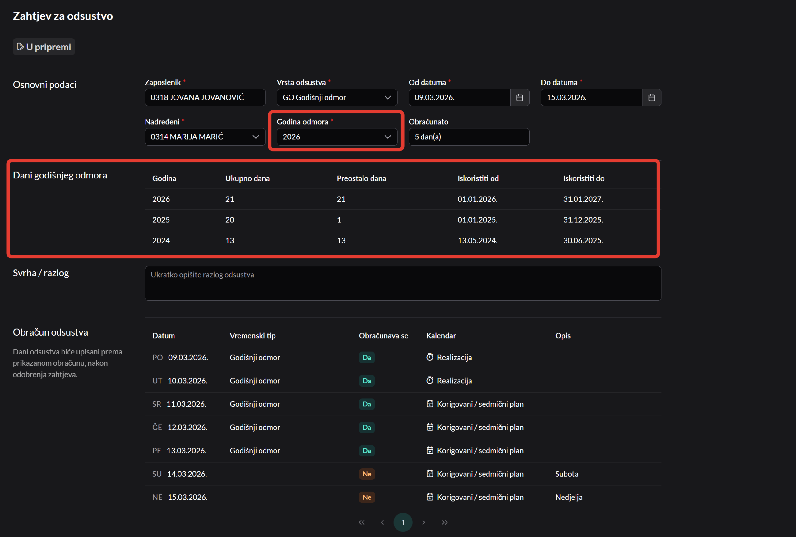 Preostali broj dana obračunava se i prikazuje automatski na osnovu ukupnog raspoloživog broja dana godišnjeg odmora i već obračunatih dana odsustva po prethodno odobrenim zahtjevima.