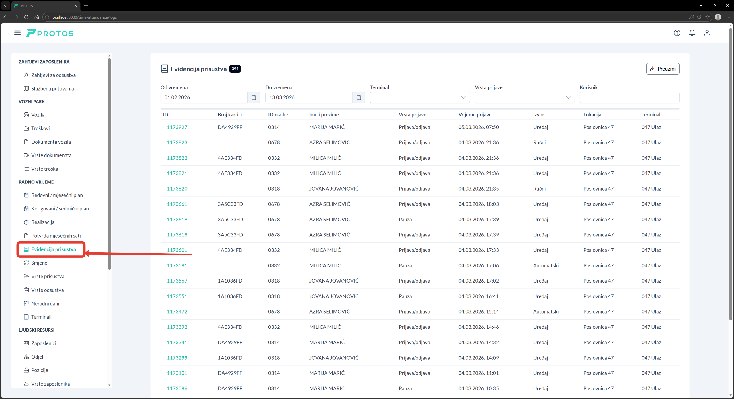 | Izvor | Izvor prijave: – Ručni – prijava je evidentirana u aplikaciji. – Uređaj – prijava je evidentirana na terminalu. – Automatski – prijava je evidentirana tokom obračuna radnog vremena prema automatskim podešavanjima smjene. |