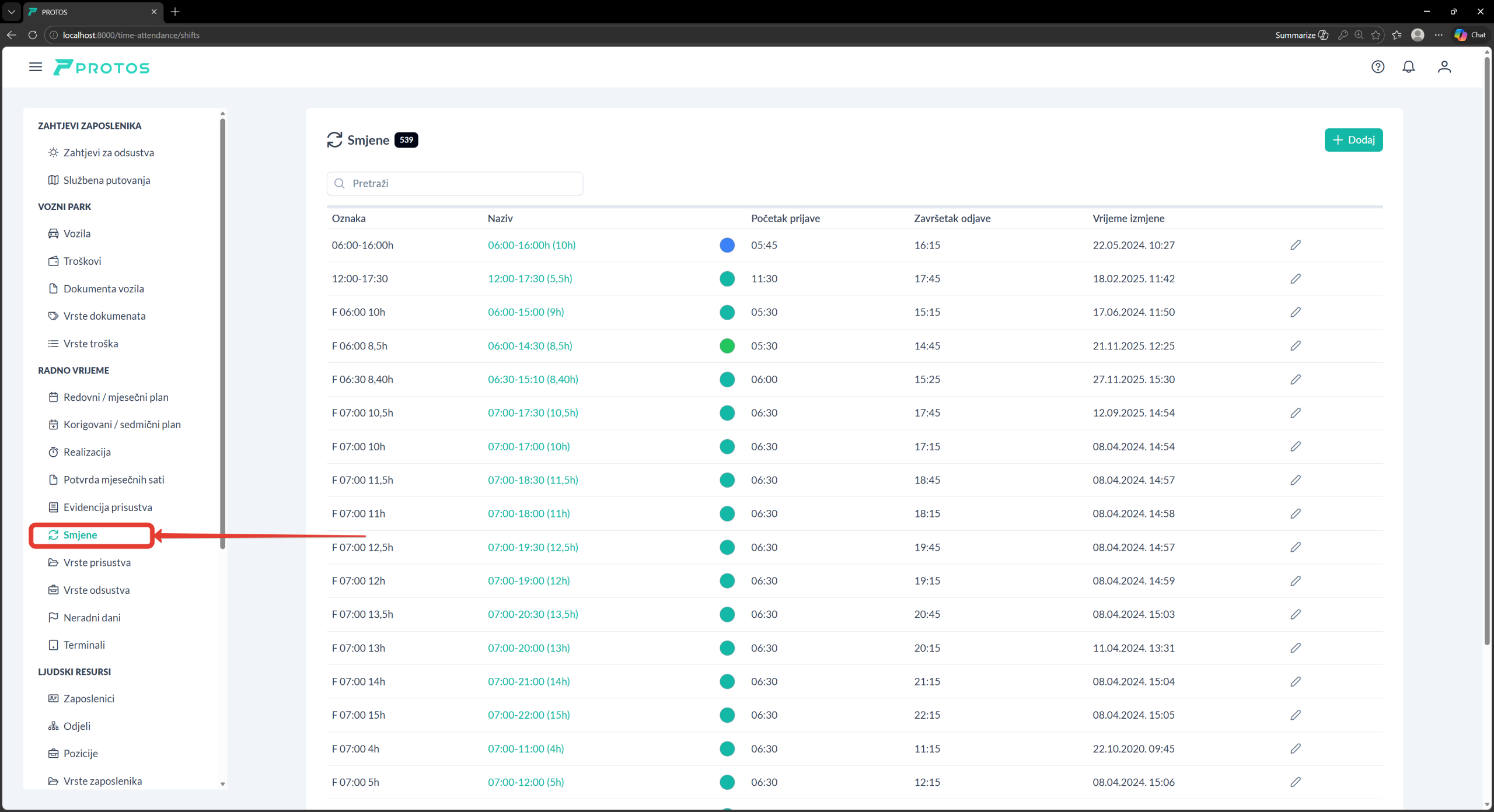 Izborom opcije Radno vrijeme > Smjene u meniju prikazuje se lista definisanih smjena.