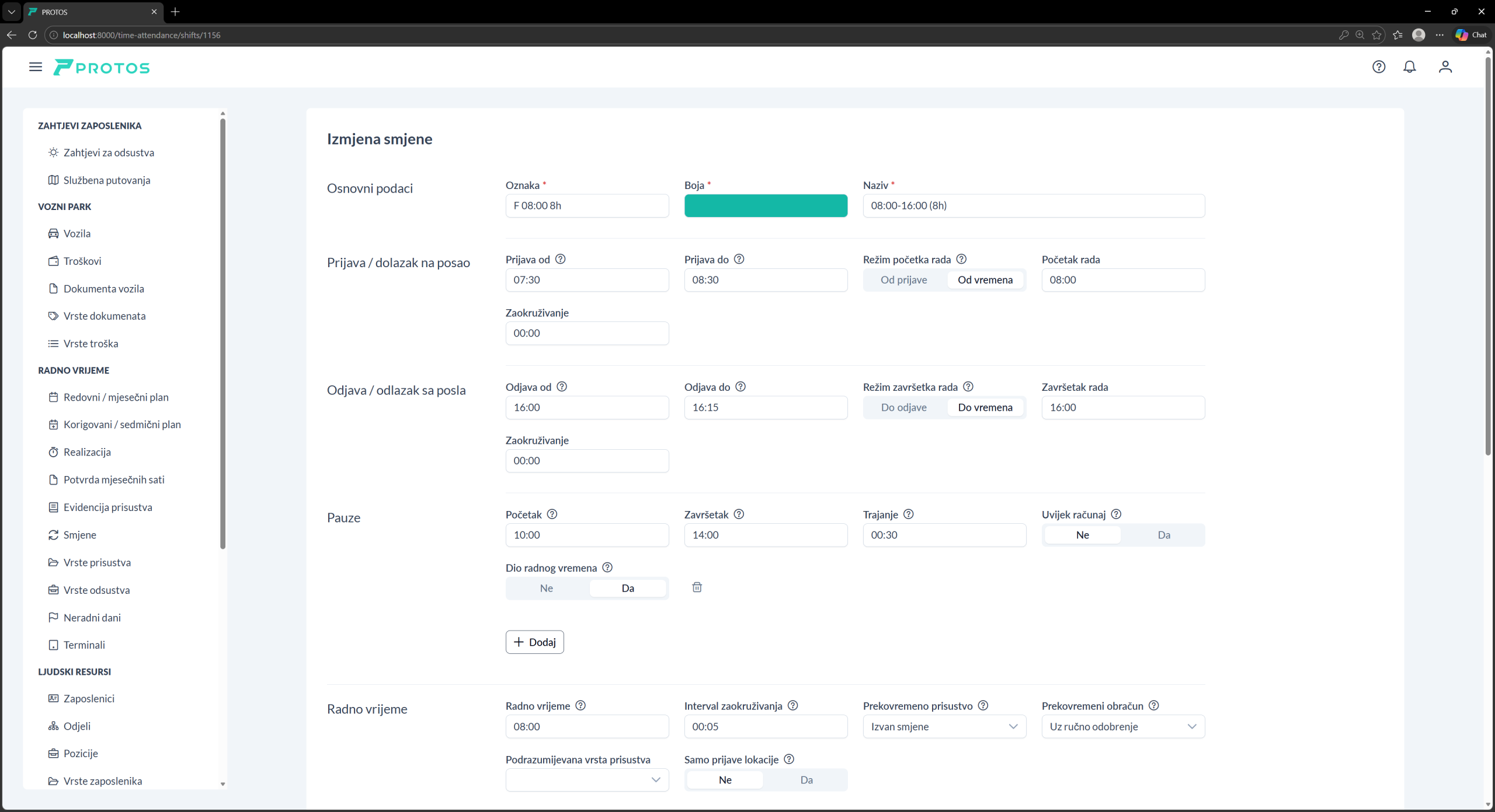U sekciji “Radno vrijeme” definišu se osnovna pravila obračuna radnog vremena za smjenu. Ovdje se podešava ukupno trajanje radnog vremena, pravila za zaokruživanje evidencije, kao i način obračuna prekovremenog rada.