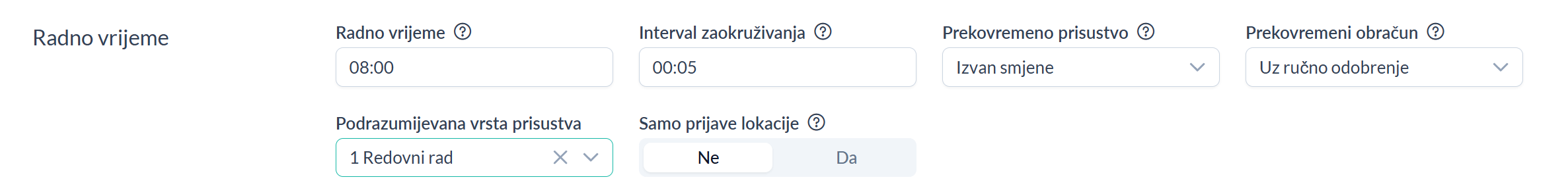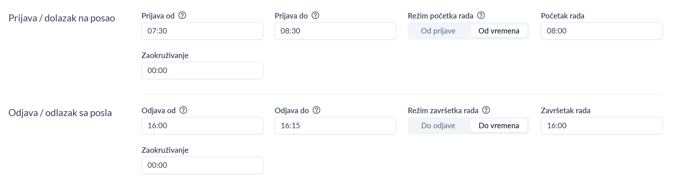 | Zaokruživanje | Zaokruživanje početka radnog vremena služi za definisanje perioda početka rada smjene. Na primjer, ukoliko je zaokruživanje podešeno na 30 minuta, počeci rada u ovom primjeru će biti obračunati kao 08:00, 08:30, 09:00 itd. Ovo podešavanje može se koristiti i za destimulaciju zaposlenika u slučaju kašnjenja izvan definisane tolerancije. Na primjer, ako je početak rada podešen u 08:00, tolerancija kašnjenja 5 minuta, a zaokruživanje na 1 sat, zaposlenik koji evidentira dolazak u 08:06, 08:15 ili 08:40 imaće početak rada obračunat od 08:00 + 01:00 (zaokruživanje), odnosno od 09:00 časova. Ukoliko je vrijednost podešena na 00:00, zaokruživanje početka rada neće biti primijenjeno. |