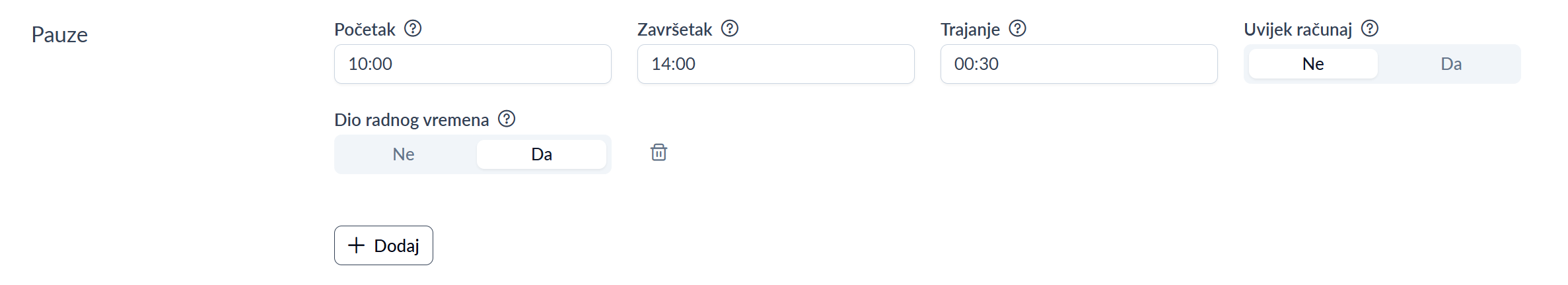 | Uvijek računaj | Ako je ova opcija označena, sistem će obračunati pauzu čak i ako zaposlenik nije evidentirao izlazak na pauzu. Ova opcija se najčešće koristi u trgovinama, gdje je korištenje pauze podijeljeno u više kraćih intervala i često podložno prekidima. |