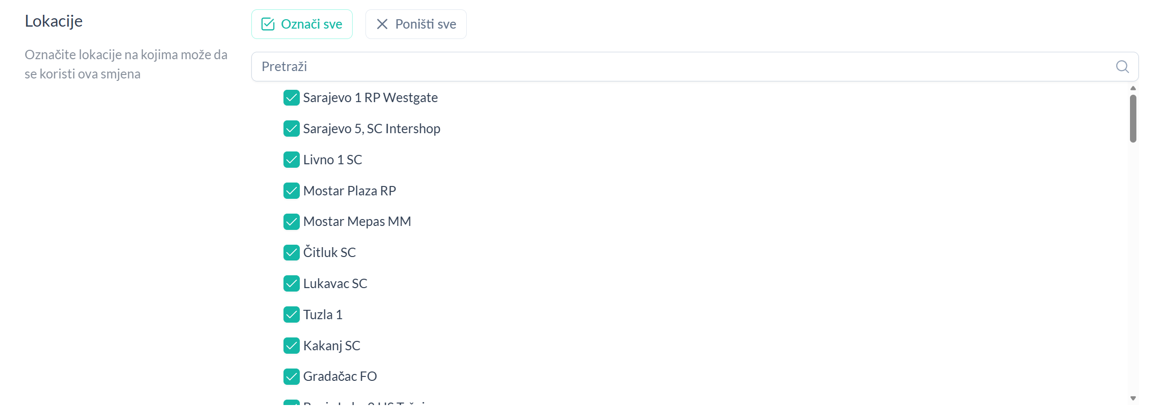 U ovoj sekciji definišu se lokacije na kojima se može koristiti ova smjena. Smjena će biti dostupna za planiranje i evidenciju radnog vremena samo na označenim lokacijama.