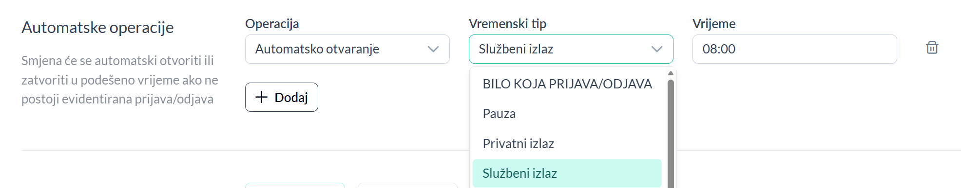 | Vremenski tip | Vremenski tip prijave koji će biti automatski evidentiran. Na primjer, ako je podešen “Službeni izlaz”, a početak smjene je u 08:00, zaposlenik može doći na posao u 10:00 i evidentirati “Službeni izlaz”. U tom slučaju sistem će automatski dodati prijavu “Službeni izlaz” u 08:00 i zatvoriti je u 10:00, nakon čega zaposlenik nastavlja redovni rad. Ukoliko zaposlenik u 10:00 evidentira neku drugu vrstu prijave, ovo pravilo neće biti primijenjeno. Ako je podešena opcija “Bilo koja prijava/odjava“, automatska operacija primjenjuje se u svim slučajevima kada zaposlenik evidentira prijavu ili odjavu. |