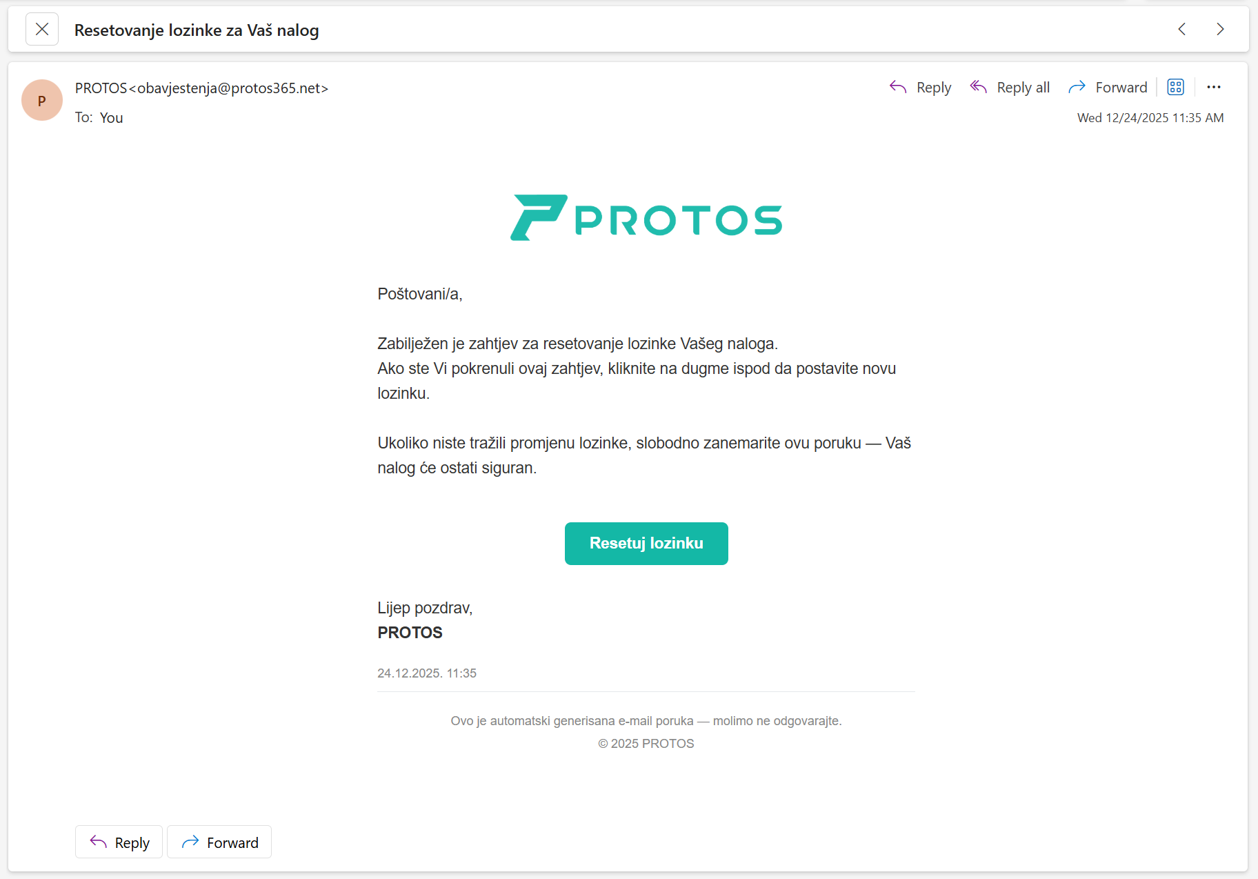 Na e-poštu ćete dobiti poruku sa instrukcijama. Kliknite na dugme Resetuj lozinku.