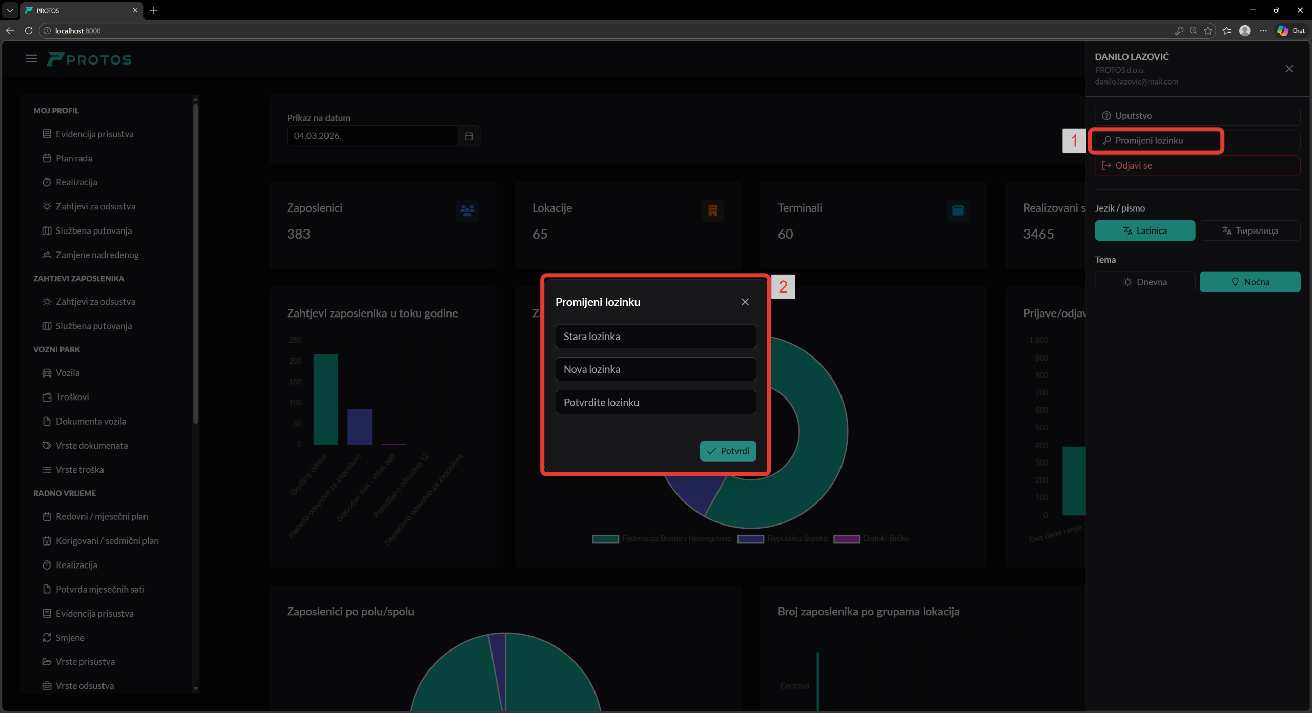 Promenu lozinke moguće je izvršiti putem korisničkog menija u gornjem desnom uglu ekrana.